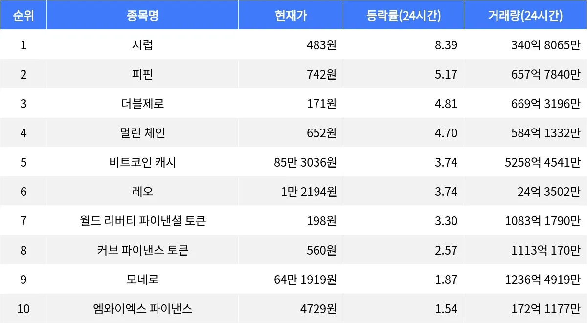 글로벌 가상자산 시황 중계 사이트 코인마켓캡(CoinMarketCap)에 따르면, 암호화폐 시장에서 시럽이 24시간 동안 가장 높은 상승률을 기록하며 눈길을 끌고 있다. 시럽은 24시간 동안 8.39% 상승하며 현재 483원에 거래되고 있다. 시가총액 순위 100위에 위치한 시럽은 1시간 동안 1.24% 하락했지만, 24시간 동안의 강세가 두드러진다. 24시간 거래량은 340억 8065만 원으로 높은 관심을 받고 있다.