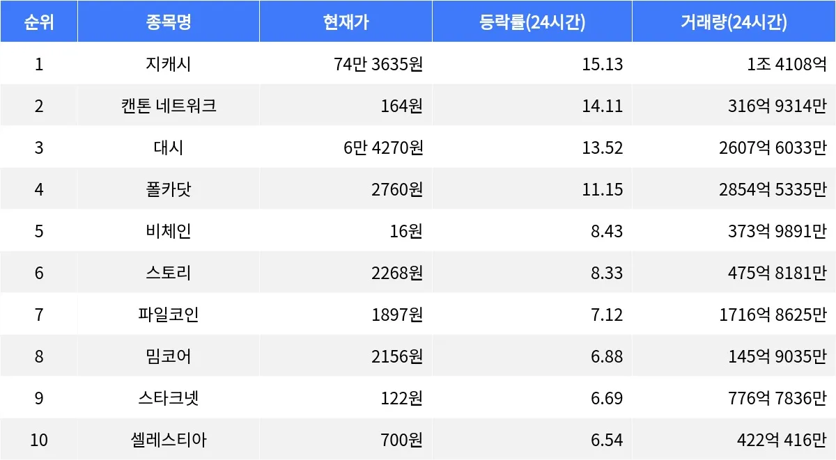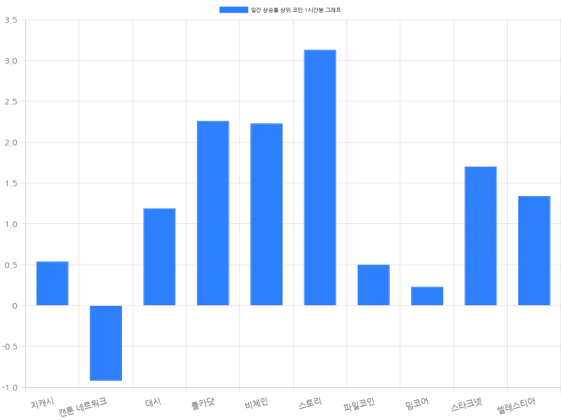 스토리는 24시간 동안 8.33% 상승해 2268원에 거래 중이며, 1시간 동안 3.13% 상승하며 강세를 보이고 있다. 한편, 파일코인은 24시간 동안 7.12% 상승하며 1897원에 거래되고 있으며, 1시간 동안 0.50%의 상승세를 기록했다. 밈코어는 24시간 동안 6.88% 상승해 2156원에 거래되고 있고, 1시간 동안 0.23%의 소폭 상승을 보이고 있다. 스타크넷은 24시간 동안 6.69% 상승하며 122원에 거래되며, 1시간 동안 1.70% 상승세를 기록했다. 셀레스티아는 24시간 동안 6.54% 상승해 700원에 거래되고 있으며, 1시간 동안 1.34% 상승하며 상승세를 이어가고 있다.