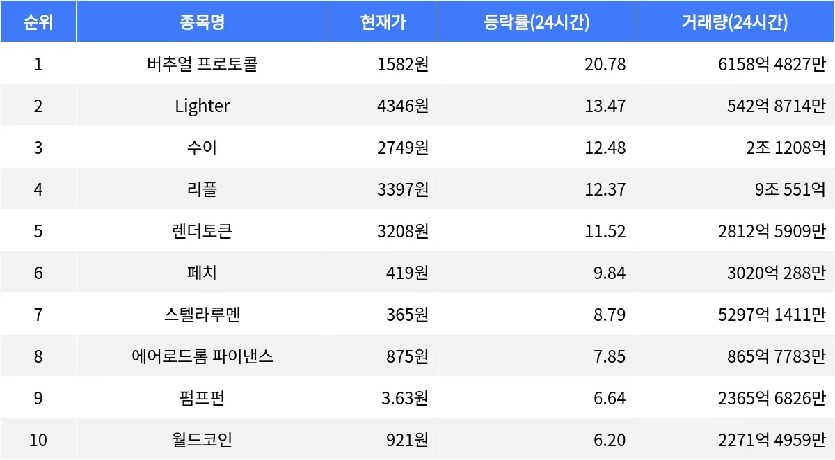 에어로드롬 파이낸스는 7.85% 상승하며 현재 875원에 거래되고 있으며, 펌프펀은 6.64% 상승하며 3.63원에 거래되고 있다. 월드코인은 6.20% 상승하며 921원에 거래 중이다.