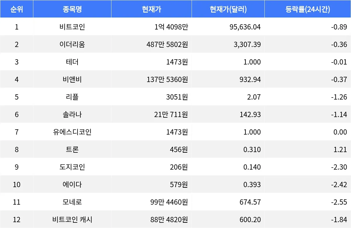 같은 시각 도지코인은 206원으로 24시간 동안 2.30% 하락했다. 에이다는 현재 579원으로, 24시간 동안 2.42% 하락했다. 모네로의 경우, 현재가는 99만 4460원으로 24시간 동안 2.55% 하락했다. 비트코인 캐시는 88만 4820원으로, 24시간 동안 1.84% 하락했다.