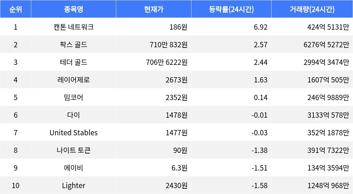 글로벌 가상자산 시황 중계 사이트 코인마켓캡(CoinMarketCap)에 따르면, 24시간 동안 암호화폐 시장에서 캔톤 네트워크가 가장 큰 상승률을 기록했다. 캔톤 네트워크는 24시간 동안 6.92% 상승하며 현재 186원에 거래되고 있으며, 시가총액 23위에 올라있다. 이 종목의 1시간 등락률은 0.98%로, 단기적으로도 상승세를 유지하고 있다. 24시간 거래량은 424억 5131만 주로 나타났다.