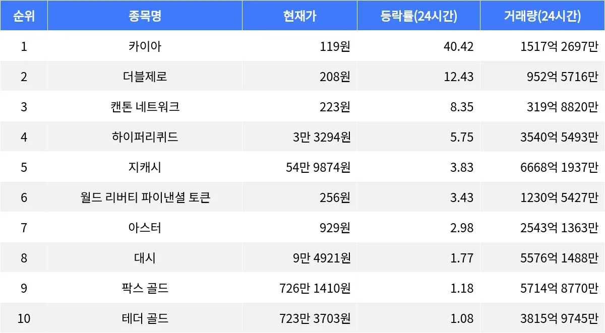 카이아는 최근 강력한 상승세를 보여주며 시장의 관심을 끌고 있다. 더블제로는 안정적인 상승세를 지속하며 투자자들의 주목을 받고 있다. 캔톤 네트워크와 하이퍼리퀴드 역시 거래량과 시가총액 측면에서 눈에 띄는 성과를 보이고 있다. 이러한 종목들은 기술적 측면에서 다양한 블록체인 솔루션과 결합되어 다양한 분야에서 활용되고 있으며, 이러한 활용성이 최근 시장에서 긍정적인 평가를 받고 있는 것으로 보인다.