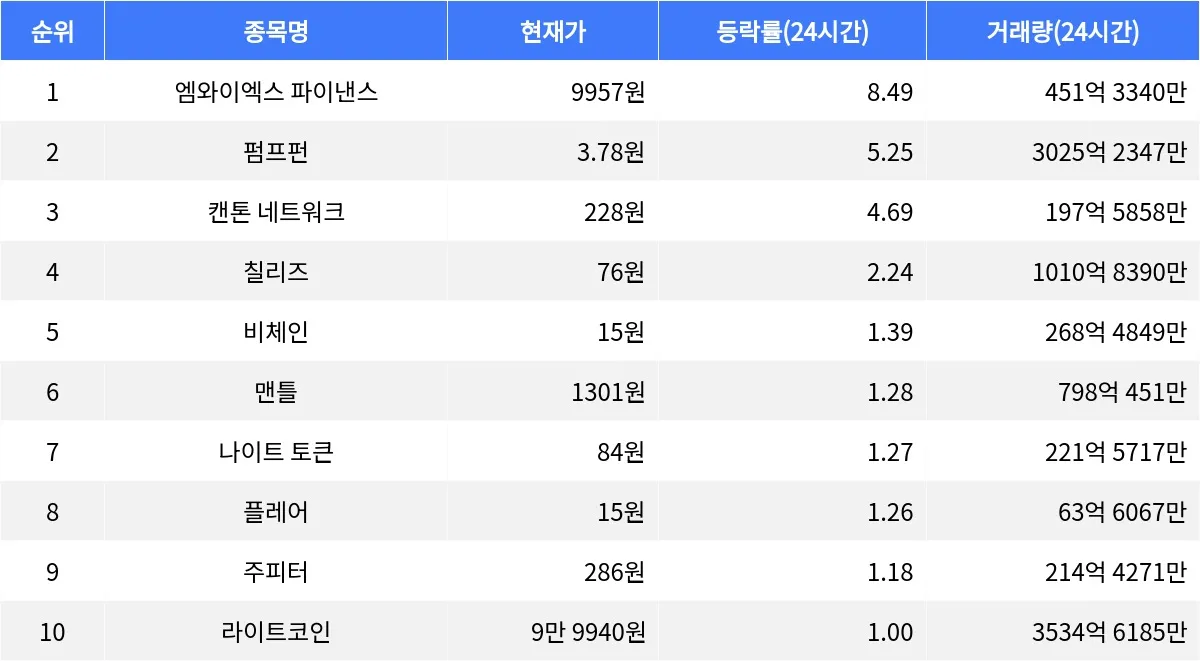 글로벌 가상자산 시황 중계 사이트 코인마켓캡(CoinMarketCap)에 따르면, 최근 암호화폐 시장에서 엠와이엑스 파이낸스의 상승세가 주목받고 있다. 엠와이엑스 파이낸스는 24시간 동안 8.49% 상승하며 현재 9957원에 거래되고 있다. 이 종목은 시가총액 2조 5040억 원으로 시가총액 순위 45위를 기록하고 있으며, 24시간 거래량은 451억 3340만 원에 달한다. 1시간 동안 2% 추가 상승을 기록하며 단기 상승세가 지속되고 있다.