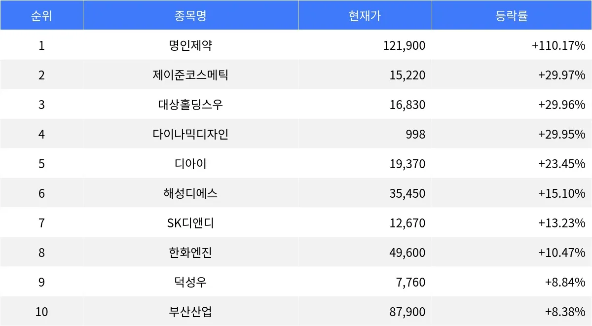 해성디에스(195870)는 등락률 15.10%로 현재가 35,450원을 기록했다. SK디앤디(210980)는 등락률 13.23%로 현재가 12,670원을 보였다. 한화엔진(082740)은 등락률 10.47%로 현재가 49,600원을 기록했다. 덕성우(004835)는 등락률 8.84%로 현재가 7,760원을 보였으며, 부산산업(011390)은 등락률 8.38%로 현재가 87,900원을 기록했다.
