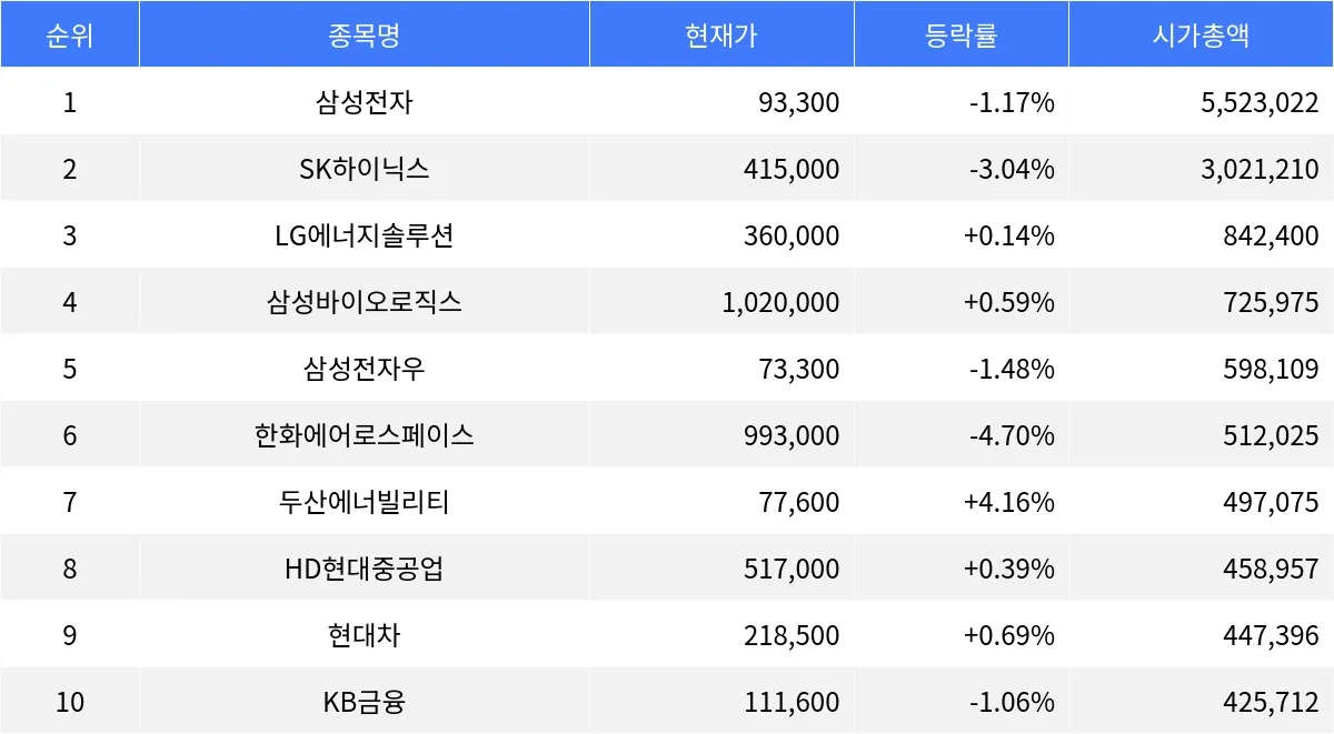 하락 종목으로는 한화에어로스페이스(012450)가 4.70% 하락하며 993,000원에 마감되었고, 삼성전자우(005935)는 1.48% 하락하였다. KB금융(105560)은 1.06% 하락하며 111,600원을 기록하였다. 이 외의 종목들은 보합세를 보였다.
