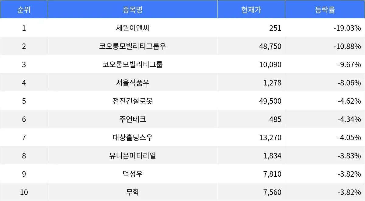 9위는 덕성우(004835)로 등락률 -3.82%, 현재가는 7,810원이었다.