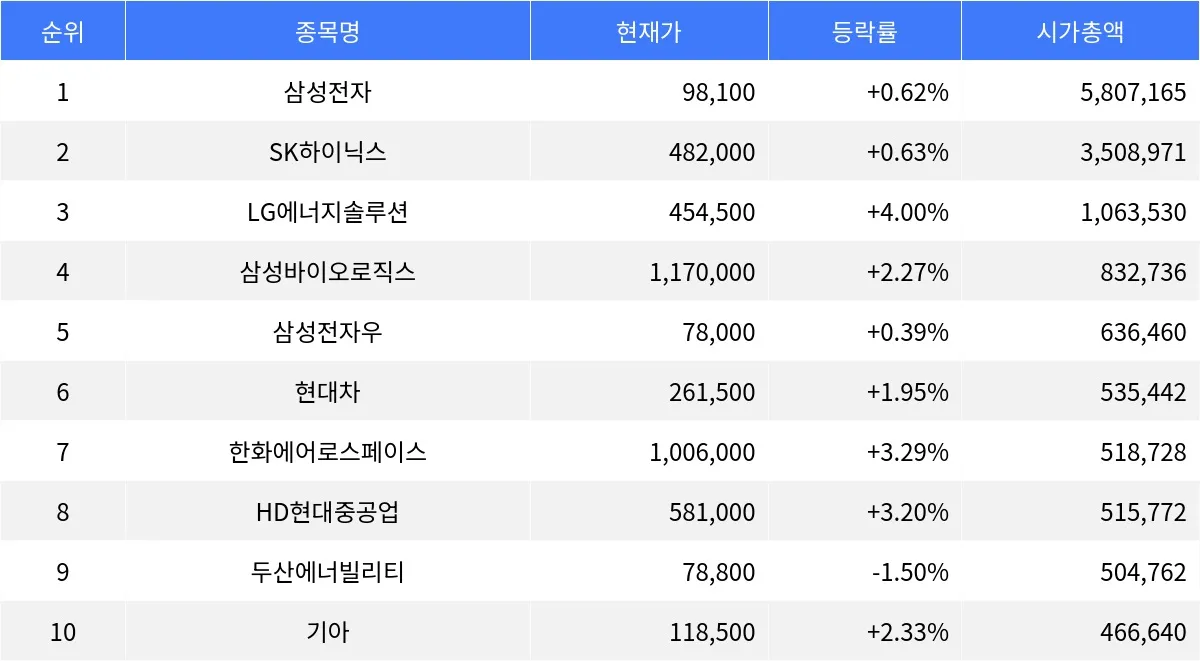 시가총액 3위에서 10위 종목 중 LG에너지솔루션(373220)은 4.00% 상승하여 454,500원을 기록했다. 삼성바이오로직스(207940)는 1,170,000원으로 2.27% 상승했으며, 현대차(005380)는 261,500원으로 1.95% 상승했다. 한화에어로스페이스(012450)와 HD현대중공업(329180)은 각각 3.29%, 3.20% 상승하며 강세를 보였다. 기아(000270)도 2.33% 상승하여 118,500원을 기록했다.