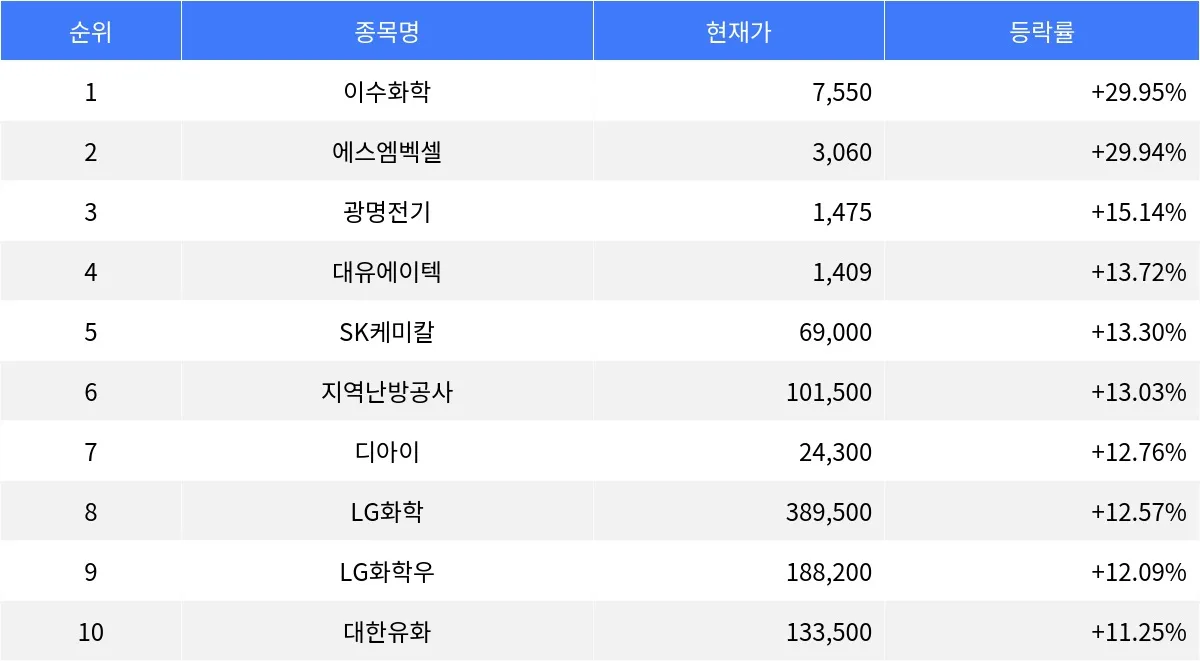 지역난방공사(071320)는 13.03% 상승한 101,500원, 디아이(003160)는 12.76% 증가한 24,300원, LG화학(051910)는 12.57% 오른 389,500원으로 각각 장을 마감했다. LG화학우(051915)는 12.09% 상승한 188,200원을 기록했으며, 대한유화(006650)는 11.25% 오른 133,500원으로 거래를 마쳤다.