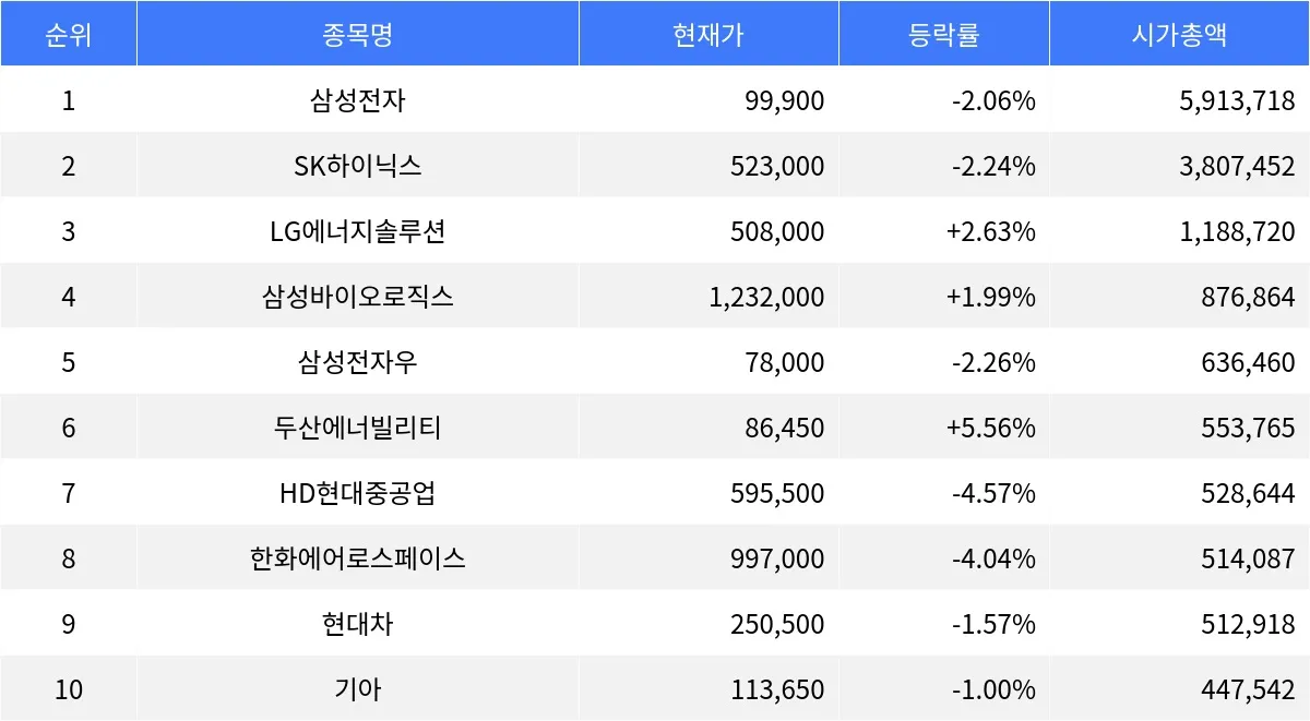 삼성전자 -2.06%, SK하이닉스 -2.24%, LG에너지솔루션 +2.63%...