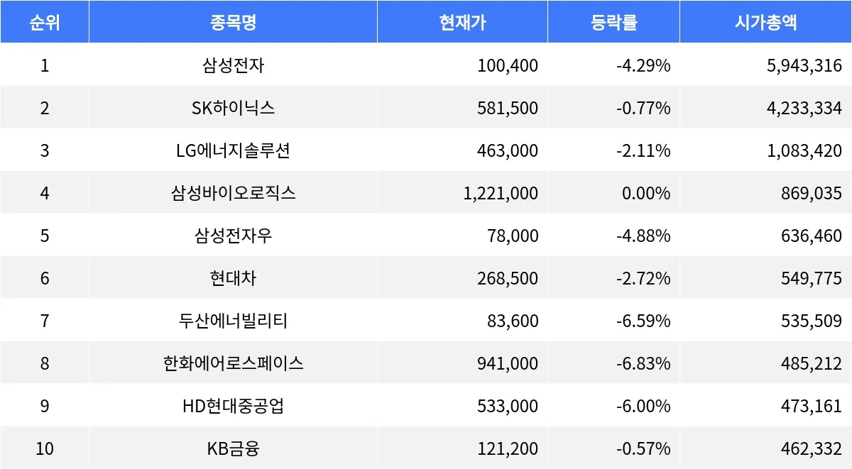 하락 종목으로는 LG에너지솔루션(373220)이 2.11% 하락하며 463,000원에 마감했고, 거래량은 431,995주를 기록했다. 삼성바이오로직스(207940)는 보합세를 유지하며 1,221,000원에 거래를 마쳤다. 삼성전자우(005935)는 4.88% 떨어지며 78,000원에 마감했다. 현대차(005380)는 2.72% 하락하며 268,500원에 거래를 마쳤다. 두산에너빌리티(034020)는 6.59% 하락하여 83,600원에 마감했고, 한화에어로스페이스(012450)는 6.83% 하락하며 941,000원에 거래를 마쳤다. HD현대중공업(329180)은 6.00% 하락하여 533,000원에 마감했고, KB금융(105560)은 0.57% 하락하여 121,200원에 거래를 마쳤다.