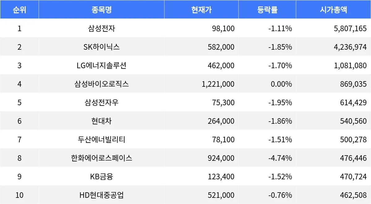 시가총액 3위부터 10위 종목 중에서는 상승한 종목이 없었다.