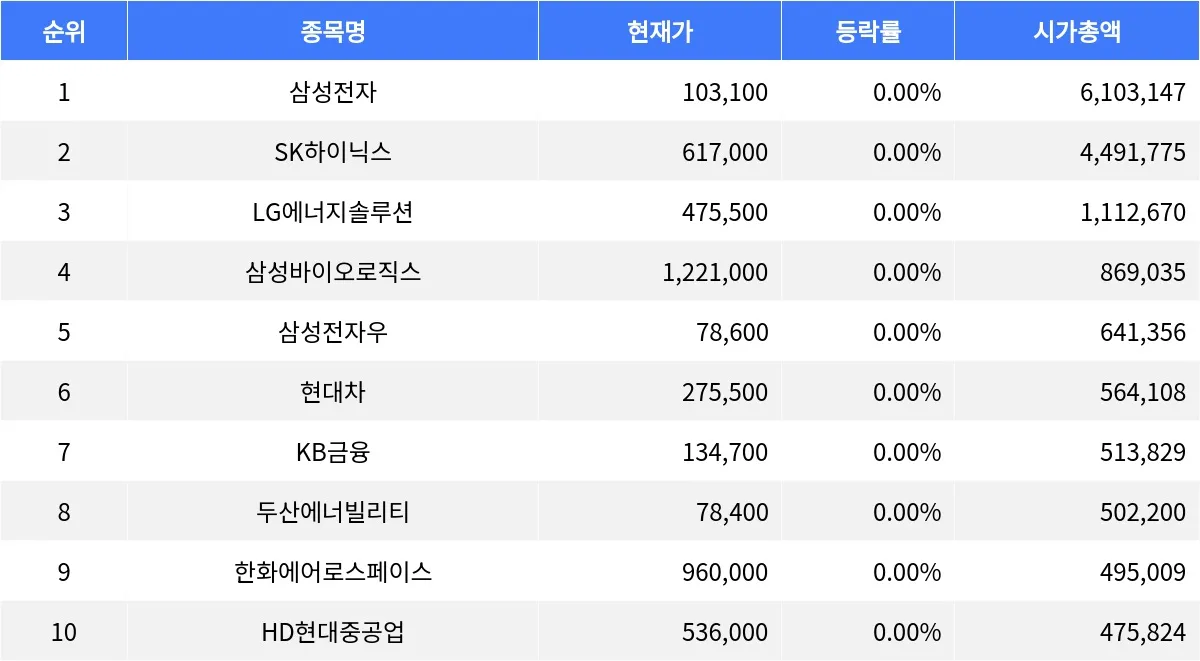 시가총액 3위부터 10위까지의 종목인 LG에너지솔루션(373220), 삼성바이오로직스(207940), 삼성전자우(005935), 현대차(005380), KB금융(105560), 두산에너빌리티(034020), 한화에어로스페이스(012450), HD현대중공업(329180) 모두 현재가에서 전 거래일 대비 큰 변동이 없는 상태를 유지하고 있다.
