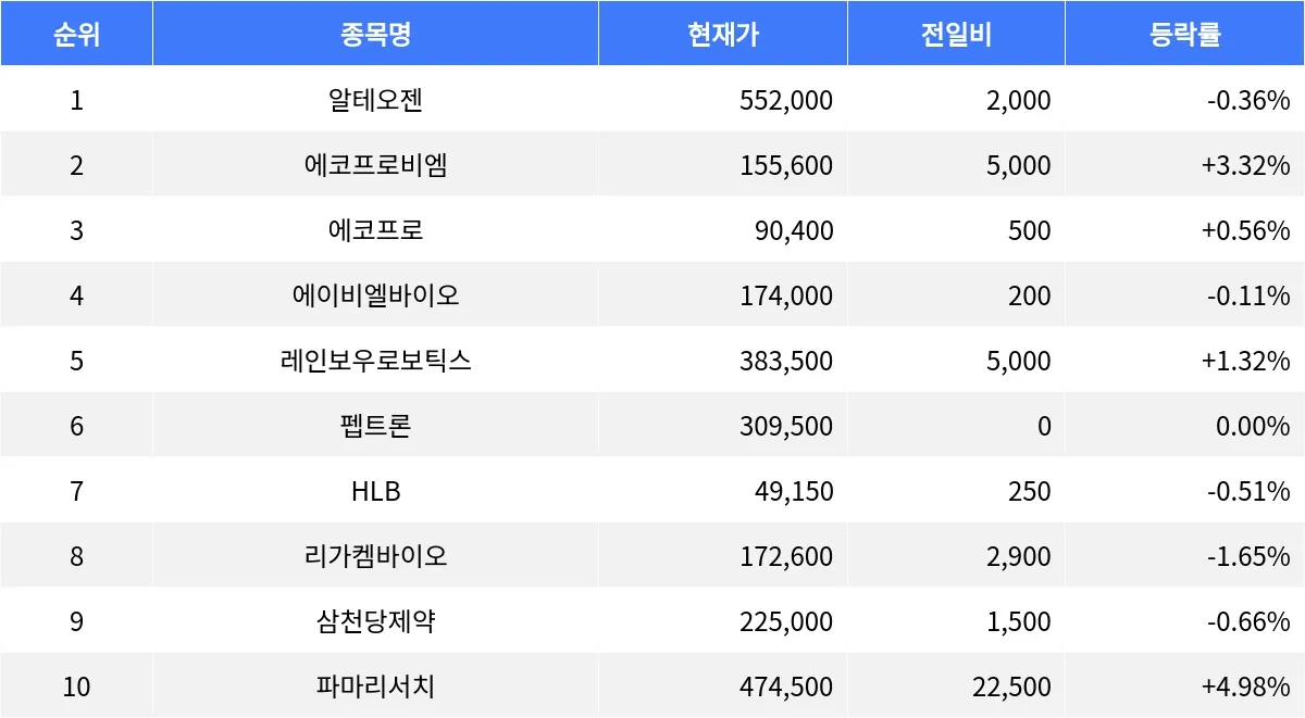 알테오젠 -0.36%, 에코프로비엠 +3.32%, 에코프로 +0.56%...