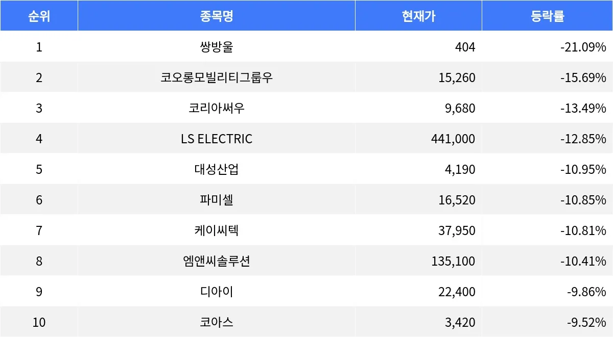 파미셀(005690)은 등락률 -10.85%로 현재가 16,520원을 기록했다. 케이씨텍(281820)은 -10.81%로 37,950원에 거래를 마쳤다. 엠앤씨솔루션(484870)은 -10.41%를 기록하며 135,100원으로 마감했다. 디아이(003160)는 등락률 -9.86%로 22,400원에 거래를 마쳤고, 코아스(071950)는 -9.52%로 3,420원에 마감했다.