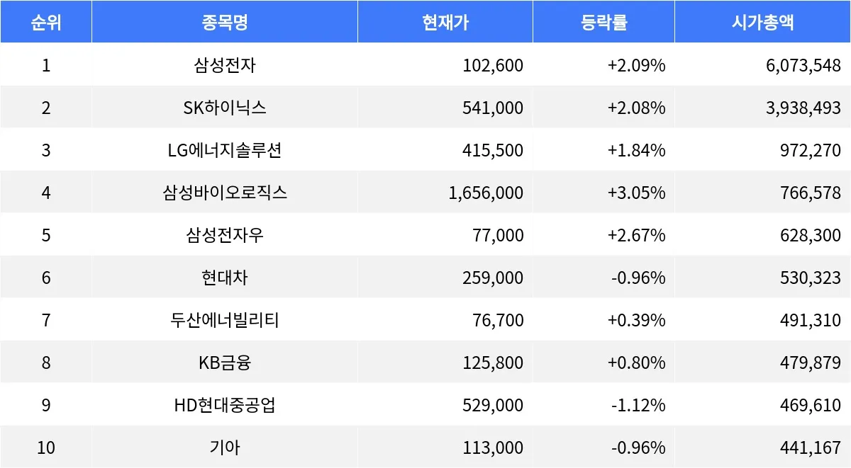 삼성전자 +2.09%, SK하이닉스 +2.08%, LG에너지솔루션 +1.84%...