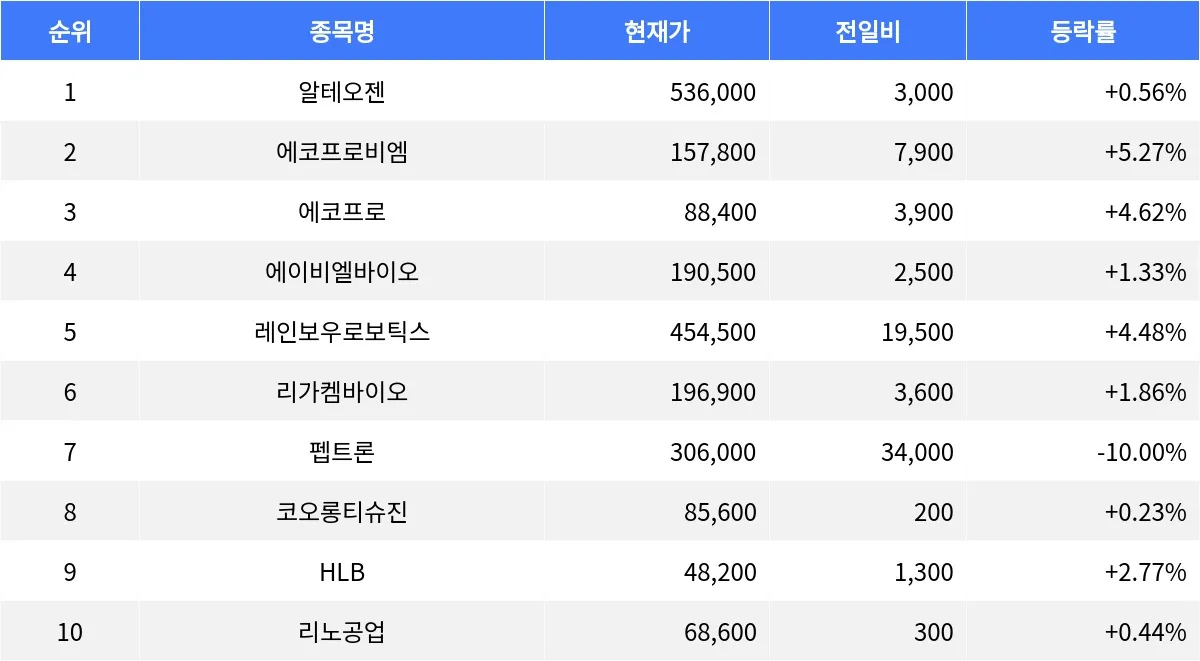 3위 에코프로(086520)는 88,400원으로 4.62% 상승하며, 거래량 550,829주를 기록하고 있다. 레인보우로보틱스(277810)는 4.48% 상승한 454,500원으로 거래량은 52,654주에 달한다. HLB(028300) 역시 2.77% 올라 48,200원에 거래되고 있으며, 거래량은 46,789주다.