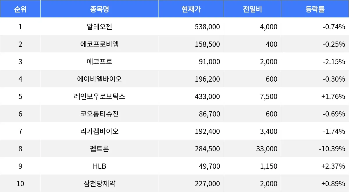 시가총액 3위부터 10위까지의 종목 중에서는 레인보우로보틱스(277810)와 HLB(028300), 삼천당제약(000250)이 상승세를 보이고 있다. 레인보우로보틱스는 433,000원으로 1.76% 상승했으며, 거래량은 29,242주에 달한다. HLB는 49,700원으로 2.37% 상승하며 57,837주의 거래량을 기록 중이다. 삼천당제약은 227,000원으로 0.89% 상승했고, 거래량은 15,149주이다.