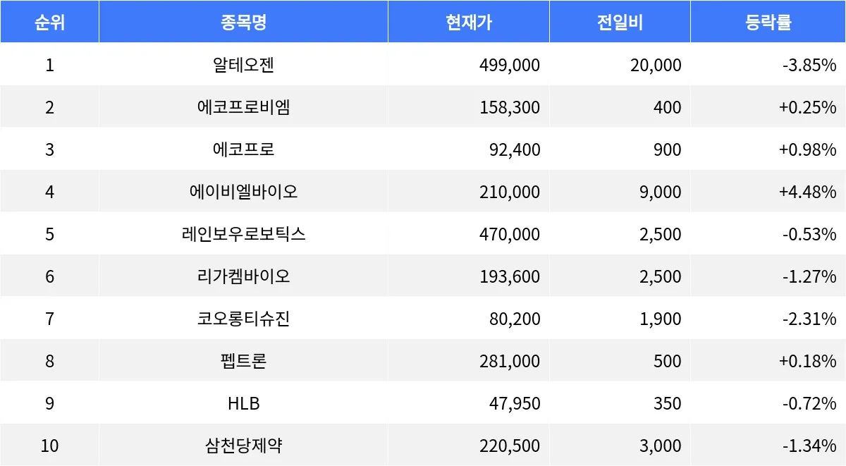 에이비엘바이오(298380)는 21만 원으로 4.48% 상승하며 거래량 31만4,637주를 기록하고 있다. 에코프로(086520)는 9만2,400원으로 전 거래일 대비 0.98% 상승하며 거래량 17만9,781주를 보였다. 펩트론(087010)은 28만1,000원으로 0.18% 오르며 거래량 2만2,745주를 기록하고 있다.