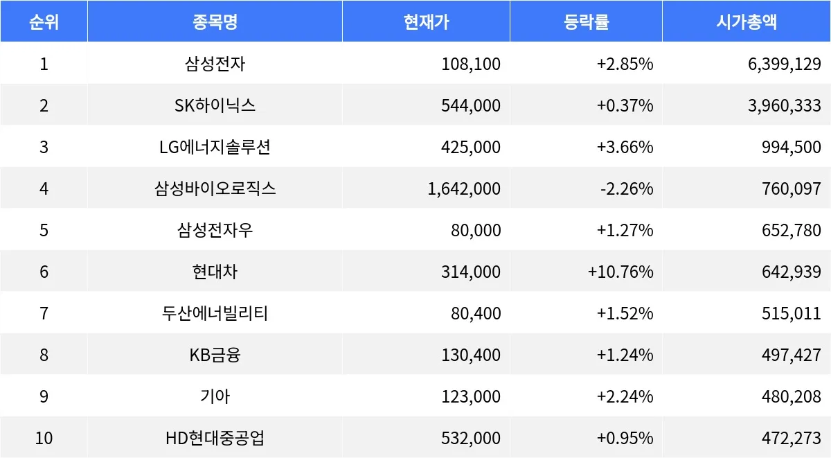 코스피 시가총액 상위 종목들이 전반적으로 상승세를 보였다.