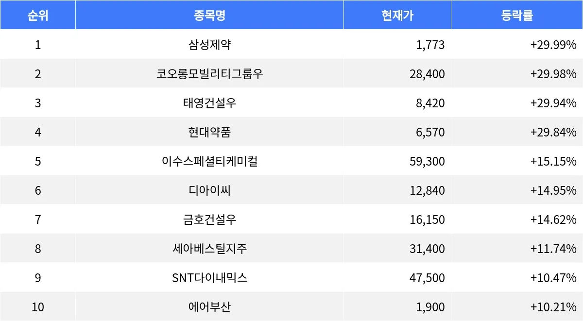 8일 장 마감 기준, 삼성제약(001360)이 등락률 +29.99%로 1위를 차지했다. 전 거래일 대비 주가는 공모가 대비 상승하며 1,773원에 마감했다. 거래량은 15,164,829주였으며, 매수총잔량은 1,912,169주, 매도총잔량은 0주로 매수세가 강했다. PER은 3.13, ROE는 -15.36이었다.