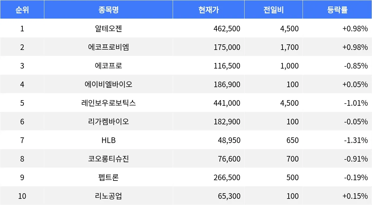 알테오젠 +0.98%, 에코프로비엠 +0.98%, 에코프로 -0.85%...