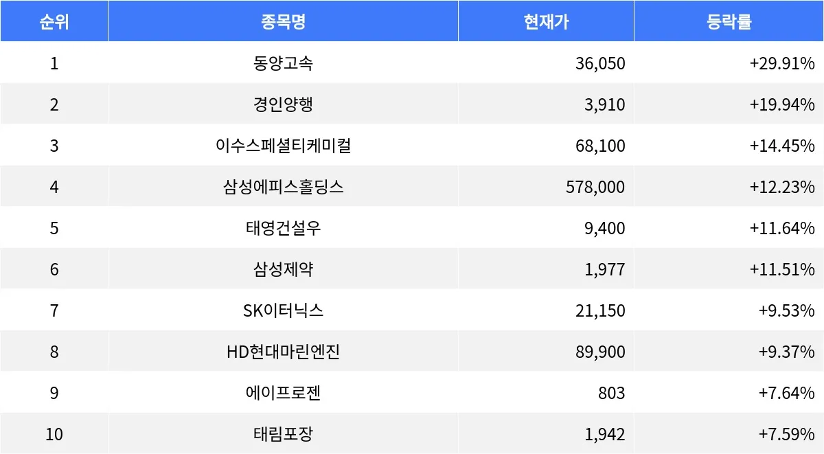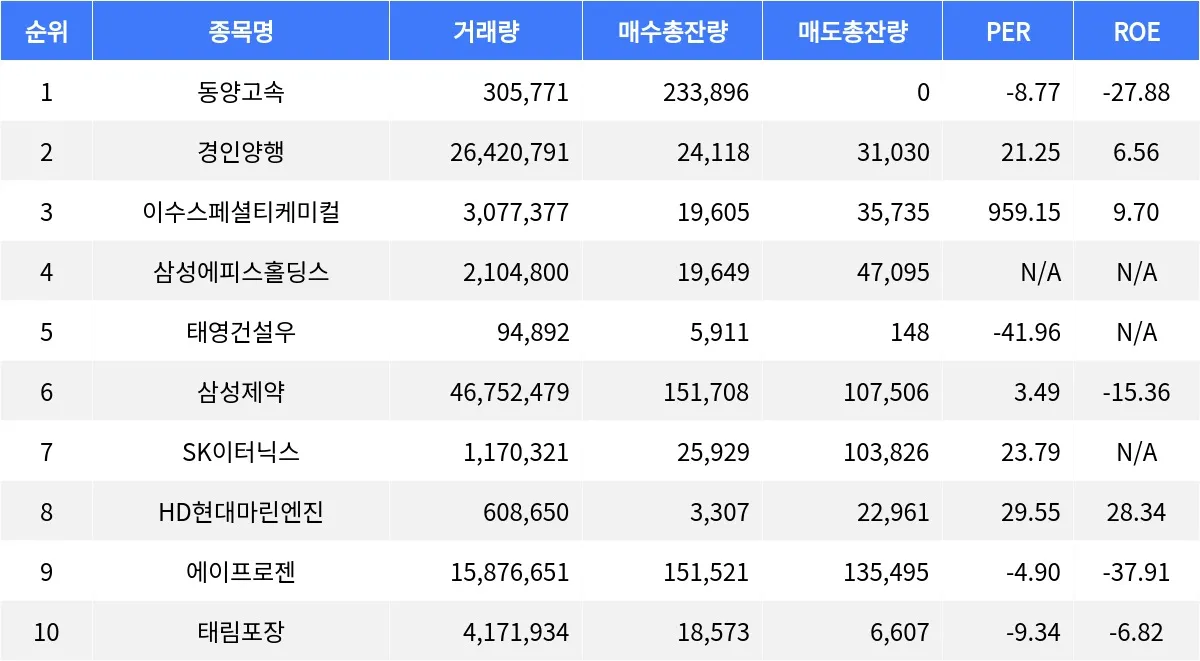 9일 장 마감 기준, 동양고속(084670)가 등락률 +29.91%로 1위를 차지했다. 현재가는 36,050원이며, 전 거래일 대비 큰 폭으로 상승했다. 거래량은 305,771주로 활발한 거래가 이루어졌으며, 매수총잔량은 233,896주, 매도총잔량은 0주로 매수세가 우위를 점했다. PER은 -8.77, ROE는 -27.88로 나타났다.