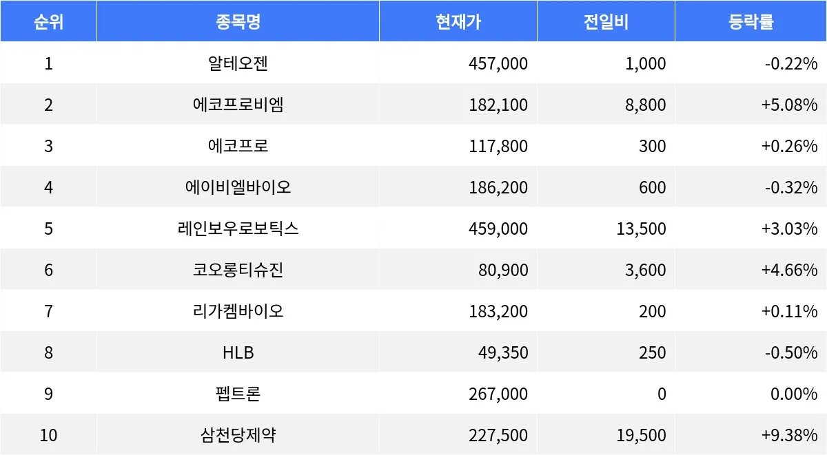 시총 3위 에코프로(086520)는 117,800원으로 0.26% 상승했으며, 거래량은 7,584,091주를 기록했다. 레인보우로보틱스(277810)는 459,000원으로 3.03% 상승하며, 거래량 274,044주를 보였다. 코오롱티슈진(950160)은 80,900원으로 4.66% 상승했고, 거래량은 590,489주였다. 리가켐바이오(141080)는 183,200원으로 소폭 상승(0.11%)하며 거래량 217,602주를 기록했다. 삼천당제약(000250)은 227,500원으로 9.38% 급등하며 거래량 336,753주를 기록했다.