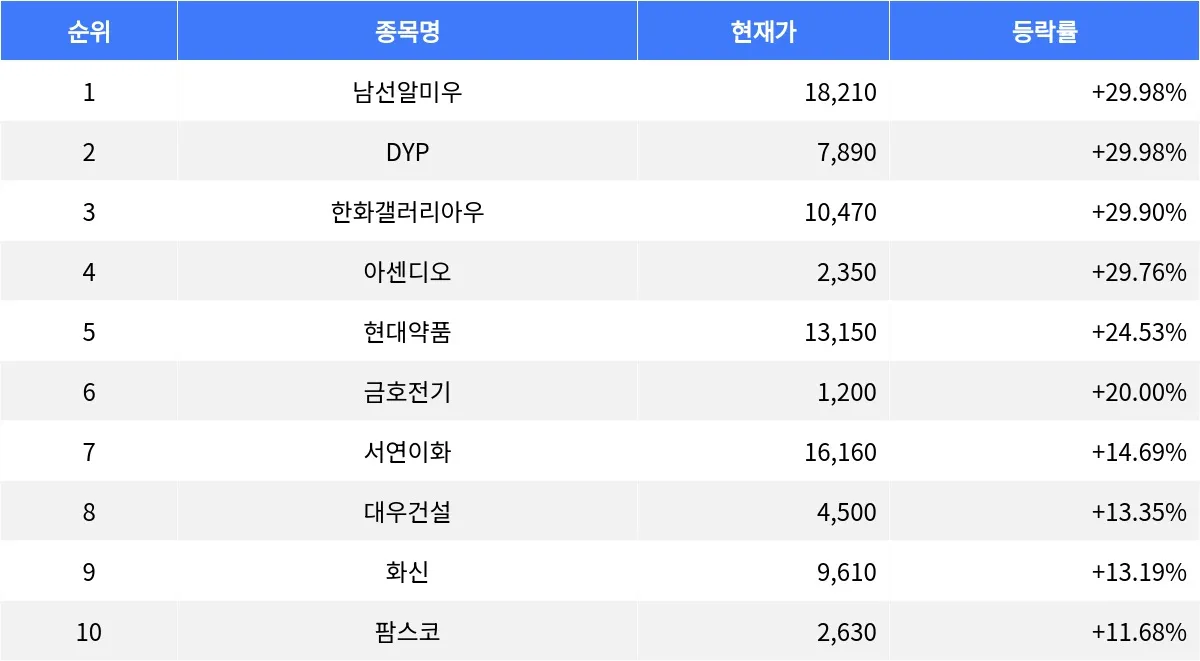 금호전기(001210)는 등락률 +20.00%로 1,200원에 마감했다. 서연이화(200880)는 +14.69%의 등락률을 기록하며 16,160원에 마감했다. 대우건설(047040)은 +13.35%로 4,500원에 마감했으며, 화신(010690)은 +13.19%로 9,610원에 마감했다. 마지막으로 팜스코(036580)는 +11.68%로 2,630원에 마감했다.