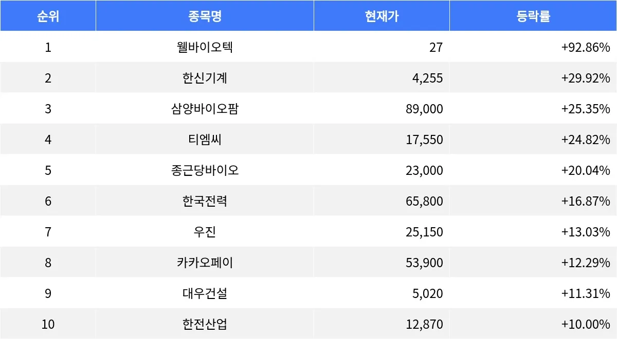 이어서, 여섯 번째로는 한국전력(015760)가 등락률 +16.87%로 상승했다. 현재가는 65,800원이다. 일곱 번째는 우진(105840)로, 등락률 +13.03%를 기록하며 현재가는 25,150원이다. 여덟 번째로는 카카오페이(377300)가 등락률 +12.29%로 상승했으며, 현재가는 53,900원이다. 아홉 번째는 대우건설(047040)로 등락률 +11.31%를 기록하며 현재가는 5,020원이다. 마지막으로 한전산업(130660)는 등락률 +10.00%로 상승했으며, 현재가는 12,870원이다.