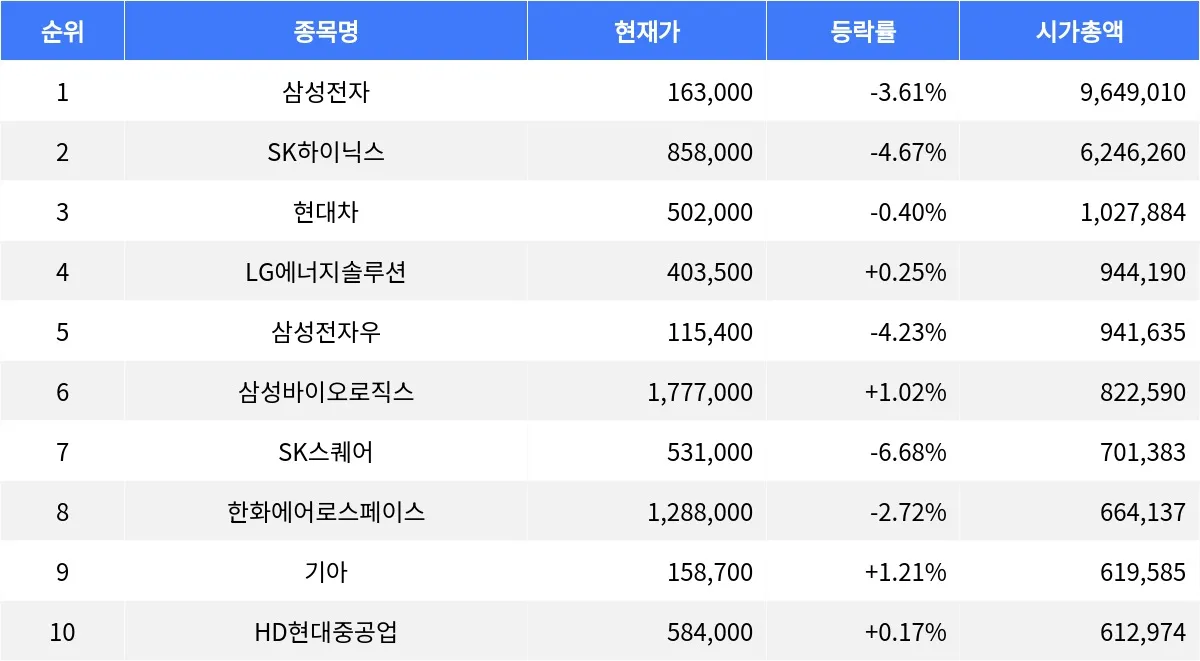 반면, 현대차(005380)는 502,000원으로 0.40% 하락하고 있으며, 삼성전자우(005935)는 115,400원으로 4.23% 하락 중이다. SK스퀘어(402340)는 531,000원으로 6.68% 하락하며 가장 큰 하락폭을 기록 중이다. 한화에어로스페이스(012450) 역시 2.72% 하락하며 1,288,000원에 거래되고 있다.