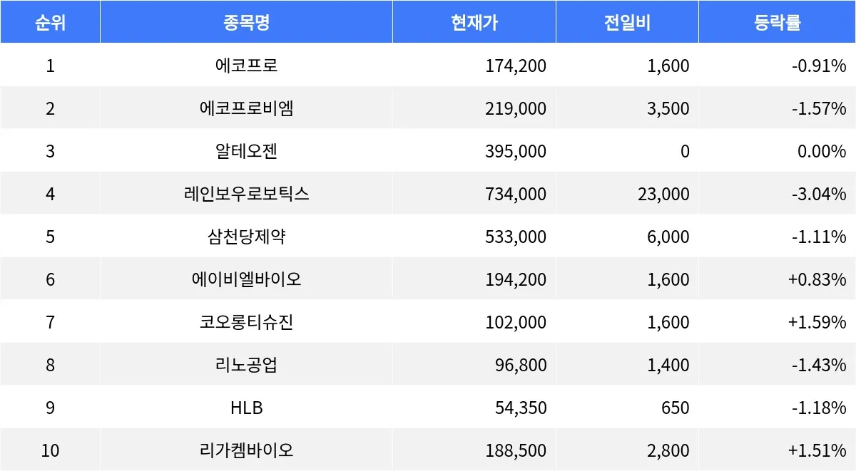 알테오젠(196170)은 395,000원으로 보합세를 유지하며, 거래량 44,230주를 기록하고 있다. 레인보우로보틱스(277810)는 734,000원으로 3.04% 하락하며 가장 큰 하락폭을 보이고 있으며, 거래량은 16,445주이다. 삼천당제약(000250)은 533,000원으로 1.11% 하락 중이며, 거래량 23,481주를 기록하고 있다. 리노공업(058470)은 96,800원으로 1.43% 하락하며, 거래량은 96,937주이다. HLB(028300)는 54,350원으로 1.18% 하락하며, 거래량 83,045주를 기록하고 있다.