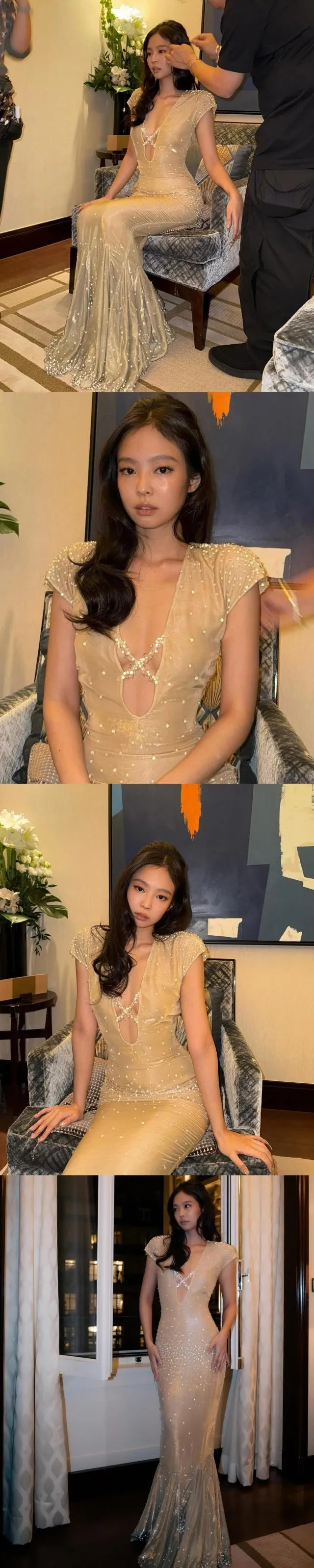 공개된 사진 속에서 제니는 골드빛이 감도는 실버 드레스를 완벽하게 소화하며 시선을 사로잡았다. 반짝이는 진주 장식과 깊게 파인 네크라인이 돋보이는 드레스는 그의 우아한 분위기를 극대화했다. 또한, 검은색 웨이브 헤어와 은은한 메이크업이 조화를 이루며 신비로운 매력을 더했다.