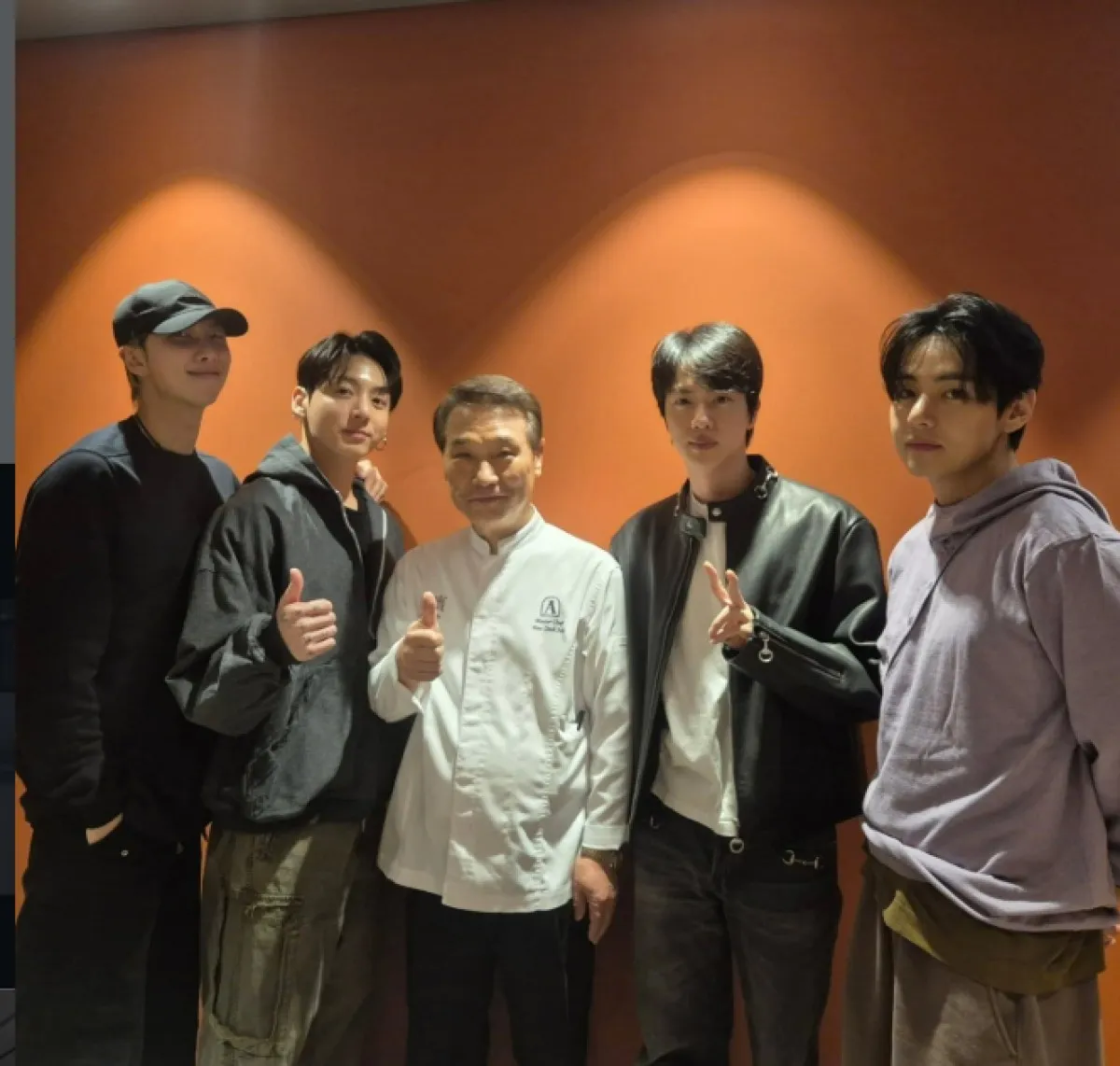 후덕죽 셰프는 지난 3일 자신의 소셜미디어(SNS)에 “글로벌 스타와 함께. 저도 팬입니다”라는 글과 함께 사진 한 장을 올렸다. 공개된 사진에는 방탄소년단의 멤버 RM, 정국, 진, 뷔가 후덕죽 셰프를 둘러싸고 환하게 웃고 있는 모습이 담겼다. 후 셰프 역시 인자한 미소로 화답하며 세대를 초월한 만남의 훈훈함을 더했다.