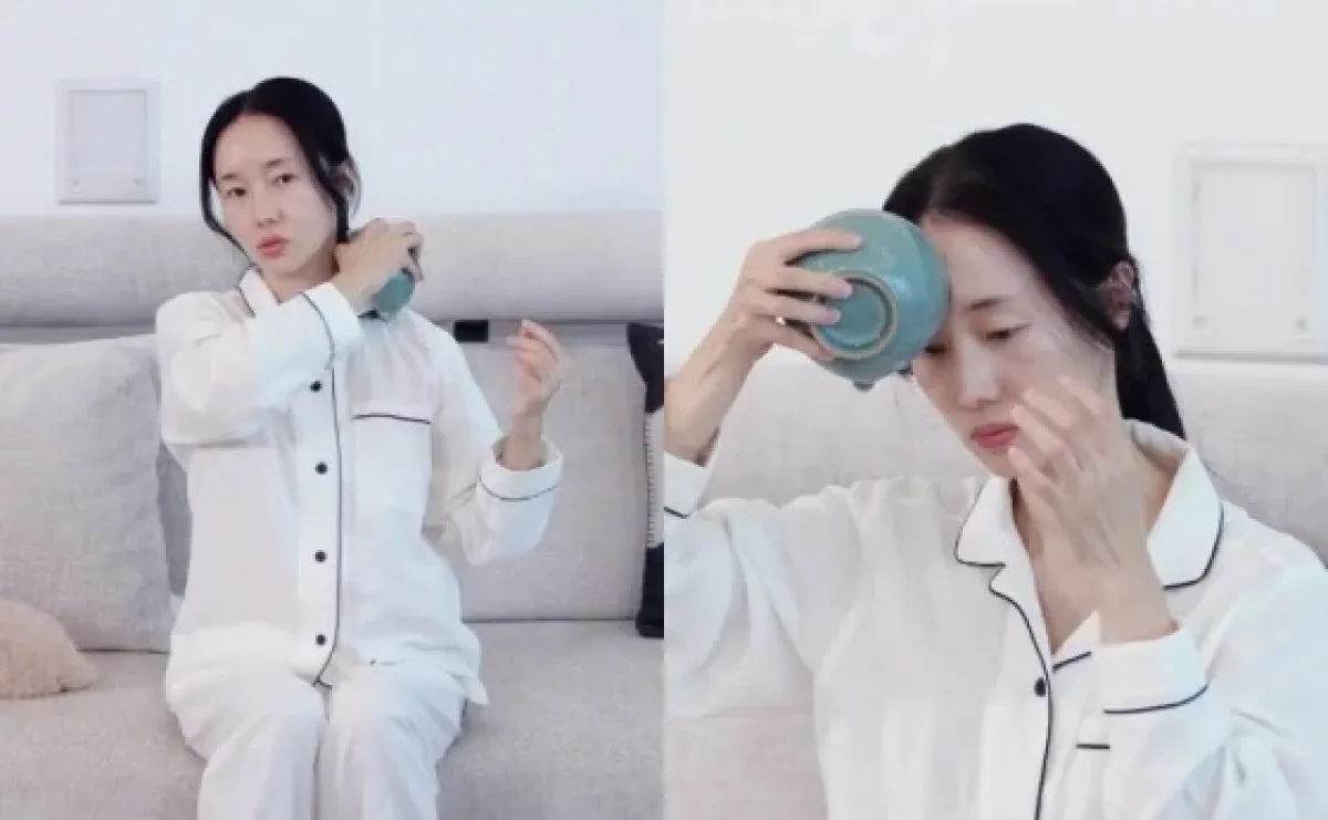 스킨케어의 하이라이트는 기초 화장을 마친 뒤에 펼쳐졌다. 이정현은 “19살 때부터 꾸준히 해 온 것이 있다”고 말하며, 갑자기 옆에 있던 찻잔을 들어 얼굴과 목 라인을 문지르기 시작했다.
