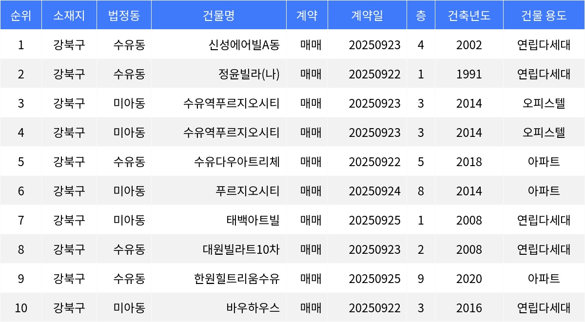 국토교통부 실거래가 공개시스템에 따르면, 9월 4주차 강북구 부동산 시장에서 수유동 신성에어빌A동이 주간 최저 매매가를 기록했다. 수유동 신성에어빌A동 26.13㎡ 4층 매물이 9천6백만원에 거래되었다.수유동 정윤빌라 59.43㎡ 1층 매물이 1억1천만원에 손바뀜이 있었다. 미아동 수유역푸르지오시티 22.426㎡ 3층 매물은 1억1천5백만원에 거래됐다. 같은 건물의 또 다른 22.426㎡ 3층 매물도 1억1천5백만원에 거래되었다.
