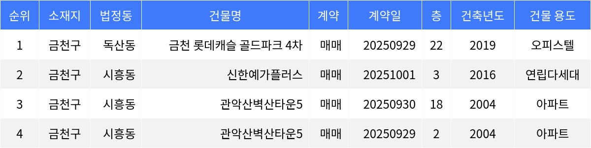 국토교통부 실거래가 공개시스템에 따르면, 10월 1주차 금천구 부동산 시장에서 독산동 금천 롯데캐슬 골드파크 4차가 주간 최저 매매가를 기록했다. 독산동 금천 롯데캐슬 골드파크 4차 26.45㎡ 22층 매물이 1억8천만원에 손바뀜이 일어났다.시흥동 신한예가플러스 43.53㎡ 3층 매물이 3억3천만원에 거래됐다. 시흥동 관악산벽산타운5 84.97㎡ 18층 매물이 5억7천만원에 새로운 주인을 찾았다.