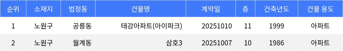 이번 주 노원구 부동산 시장에서는 공릉동과 월계동에서 각각의 매물이 주목받았다. 공릉동 태강아파트 49.6㎡ 매물은 5억2천800만원에 거래됐고, 월계동 삼호3 59.22㎡ 매물은 9억300만원에 거래됐다.