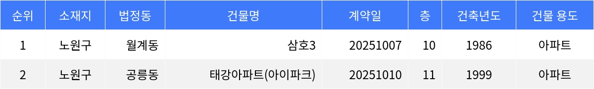 국토교통부 실거래가 공개시스템에 따르면, 10월 2주차 노원구 부동산 시장에서 월계동 삼호3 아파트가 주간 최고 매매가를 기록했다. 월계동 삼호3 59.22㎡ 10층 매물이 10월 7일에 9억300만원에 거래되었다.노원구 공릉동 소재 태강아파트 49.6㎡ 11층 매물이 5억2천800만원에 손바뀜이 일어났다.