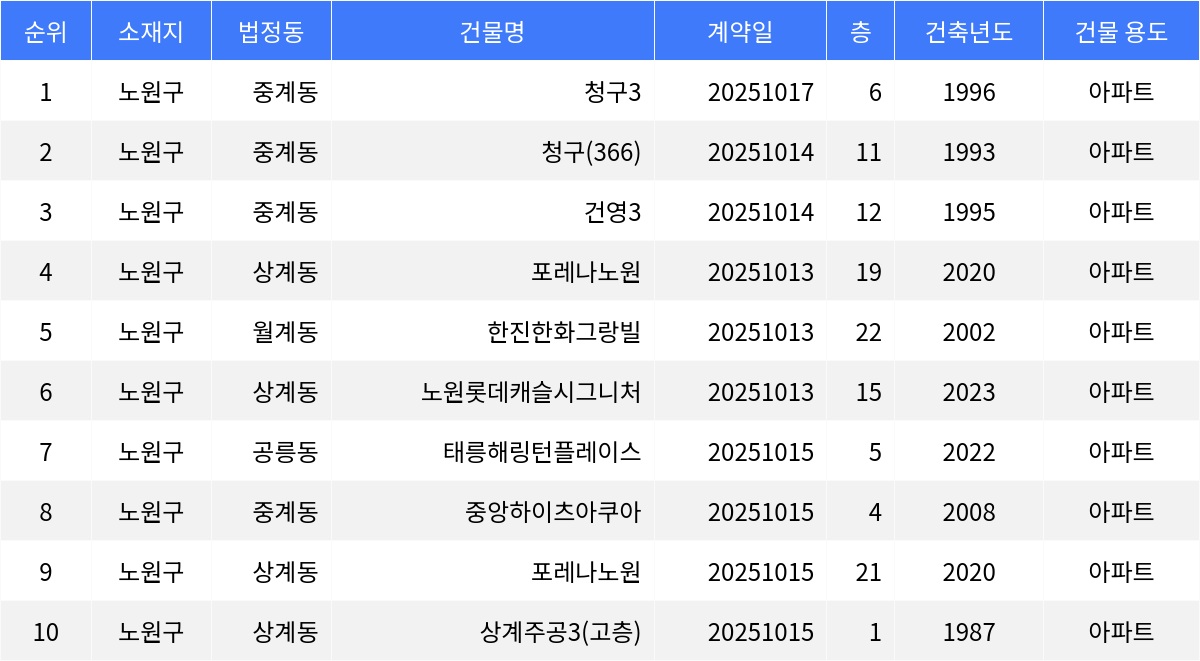 상계동 노원롯데캐슬시그니처 84.999㎡ 15층 매물이 10억7천만원에 거래됐다. 공릉동 태릉해링턴플레이스 74.95㎡ 5층 매물은 10억1천5백만원에 손바뀜이 일어났다. 중계동 중앙하이츠아쿠아 84.467㎡ 4층 매물이 9억9천만원에 거래되었다. 상계동 포레나노원 59.942㎡ 21층 매물은 9억4천5백만원에 거래되었다. 상계동 상계주공3(고층) 84.2㎡ 1층 매물이 9억3천만원에 거래되었다.
