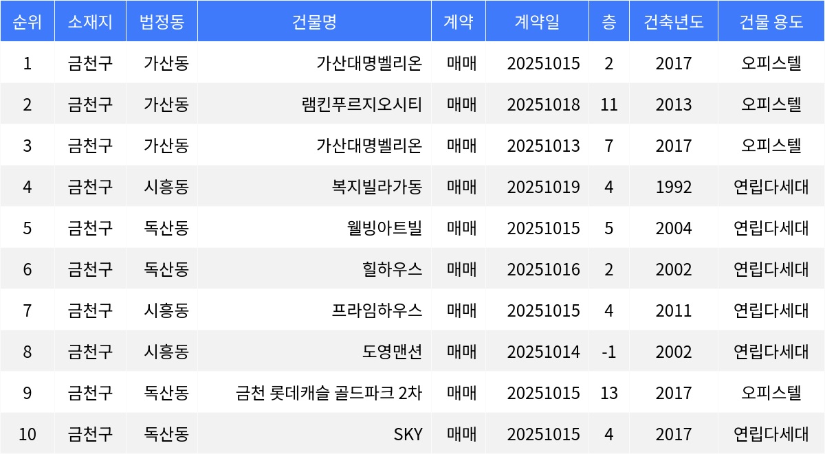 시흥동 도영맨션 42.1㎡ 지하 1층 매물이 1억8천만원에 거래됐고, 독산동 금천 롯데캐슬 골드파크 2차 27.03㎡ 13층 매물은 1억8천900만원에 매매됐다. 독산동 SKY 28.66㎡ 4층 매물이 2억300만원에 손바뀜이 일어났다.