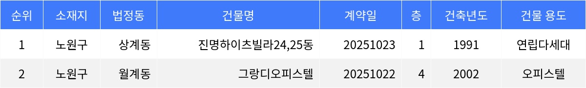 국토교통부 실거래가 공개시스템에 따르면, 10월 4주차 노원구 부동산 시장에서 상계동 진명하이츠빌라24,25동이 주간 최고 매매가를 기록했다. 상계동 진명하이츠빌라24,25동 52.02㎡ 1층 매물이 10월 23일 2억3천만원에 손바뀜이 일어났다.월계동 그랑디오피스텔 20.32㎡ 4층 매물이 6천8백만원에 거래됐다.