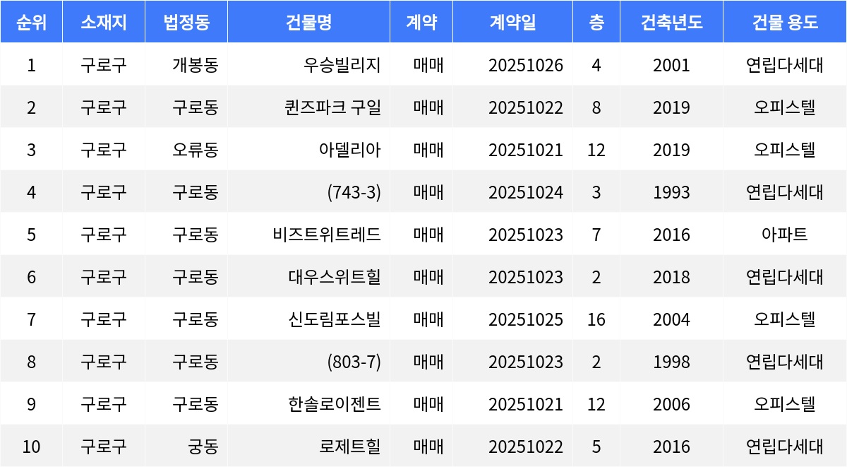 국토교통부 실거래가 공개시스템에 따르면, 10월 4주차 구로구 부동산 시장에서 개봉동 우승빌리지가 주간 최저 매매가를 기록했다. 개봉동 우승빌리지 35.61㎡ 4층 매물이 10월 26일 1억2천만원에 손바뀜이 일어났다.구로동 퀸즈파크 구일 17.363㎡ 8층 매물이 1억2천6백만원에 거래됐다. 오류동 아델리아 22.01㎡ 12층 매물은 1억3천5백만원에 매매됐다.