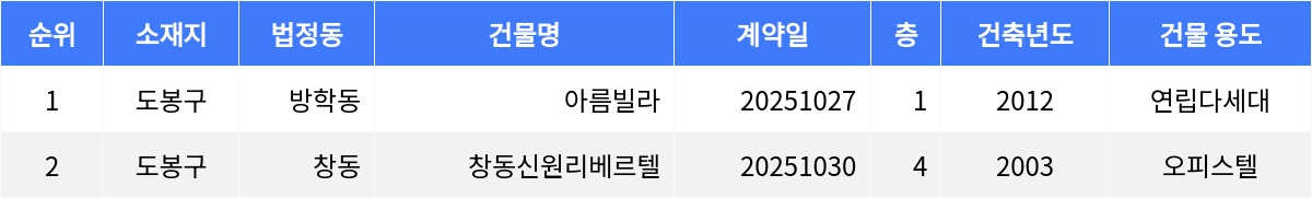 이번 거래는 도봉구의 다양한 주거 유형에 대한 관심을 반영한 것으로 보인다. 방학동과 창동에서의 거래는 각각 1억2천만원과 1억4천9백만원에 이루어졌다.