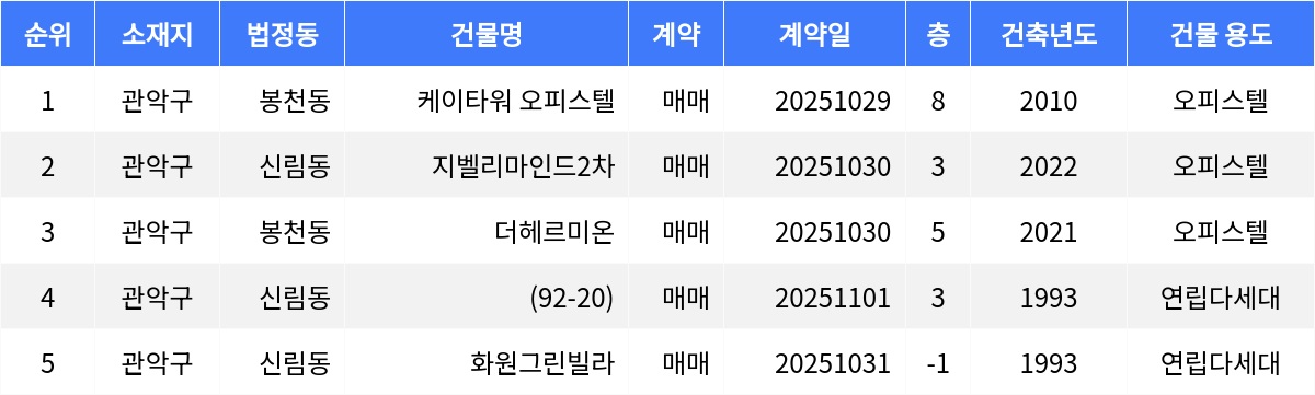 국토교통부 실거래가 공개시스템에 따르면, 10월 5주차 관악구 부동산 시장에서 봉천동 케이타워 오피스텔이 주간 최저 매매가를 기록했다. 봉천동 케이타워 오피스텔 18.24㎡ 8층 매물이 10월 29일 1억1천2백만원에 거래됐다.신림동 지벨리마인드2차 18.69㎡ 3층 매물이 2억2천만원에 거래됐다. 봉천동 더헤르미온 15.45㎡ 5층 매물이 2억4천만원에 매매됐다.