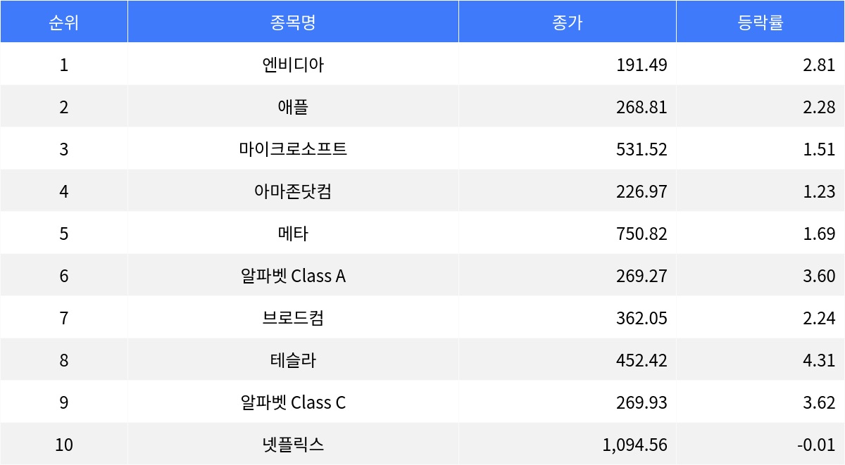 엔비디아는 2.81% 상승한 191.49달러에 마감하며, 총 1억 5천 65만 7천 757주의 거래량을 보였다. 애플도 2.28% 오른 268.81달러에 거래를 마쳤다. 거래량은 4천 272만 4천 625주였다. 마이크로소프트와 브로드컴도 각각 1.51%, 2.24% 상승하며 531.52달러, 362.05달러에 장을 마감했다.