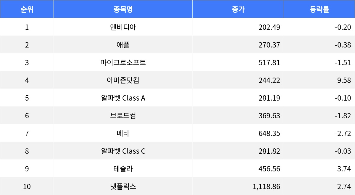 반면 메타는 2.72% 하락하며 648.35달러에 마감했다. 거래량은 5천 519만 4천 244주로 전 거래일 대비 18.12달러 하락했다. 브로드컴은 1.82% 하락해 종가 369.63달러를 기록했으며, 거래량은 2천 150만 296주로 전 거래일 대비 6.84달러 하락했다. 마이크로소프트도 1.51% 하락하여 종가 517.81달러를 기록했다. 거래량은 3천 380만 3천 950주로 전 거래일 대비 7.95달러 하락했다.