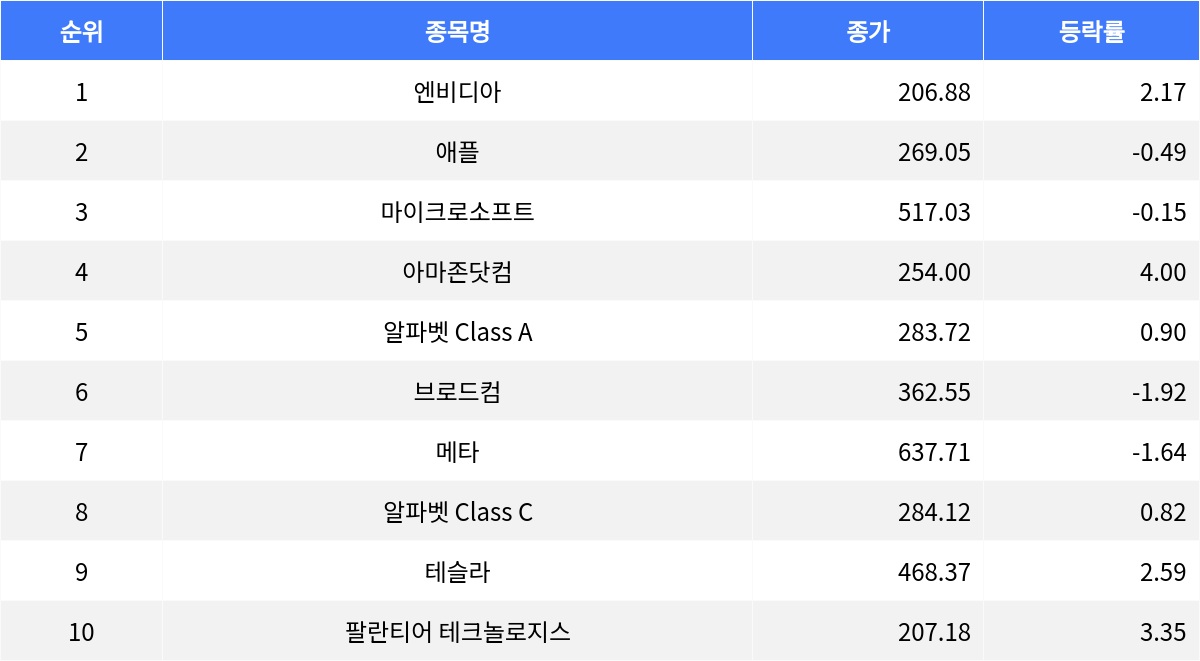 3일(현지시간) 기준, 나스닥 종합 시가총액 상위 종목은 혼조세를 보였다. 엔비디아와 아마존닷컴이 강세를 보이며 상승세를 주도한 반면 애플과 브로드컴은 하락세를 면치 못했다.엔비디아는 전 거래일 대비 2.17% 상승한 206달러 88센트에 거래를 마감했다. 거래량은 1억 7천 755만 6천 349주로, 전일비 4.39달러 상승했다. 아마존닷컴 역시 4.00% 급등하며 254달러에 마감했고, 거래량은 9천 245만 9천 531주로 전일비 9.78달러 상승했다. 테슬라도 2.59% 상승한 468달러 37센트로 거래를 마쳤다.