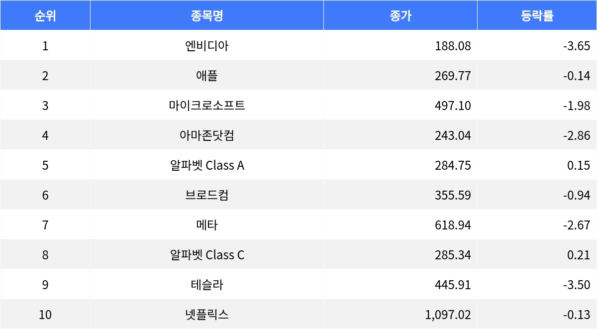 테슬라 3.50% 하락, 넷플릭스 0.13% 하락…기술주 대부분 약세