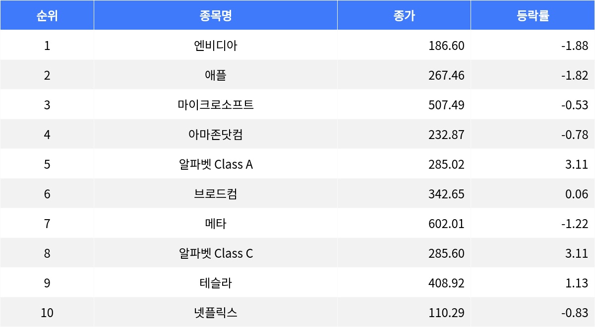 반면, 엔비디아는 1.88% 하락하여 186.60달러에 거래를 마쳤다. 거래량은 1억 7천 423만 81주로 전 거래일 대비 3.57% 감소했다. 애플도 1.82% 하락하여 267.46달러를 기록했으며, 거래량은 4천 297만 7천 962주로 전 거래일 대비 4.95% 감소했다.
