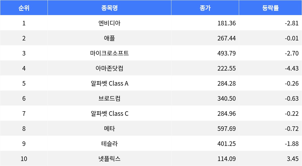 반면, 아마존닷컴은 4.43% 하락해 222.55달러로 거래를 마쳤다. 거래량은 6천 25만 4천 708주로 전 거래일 대비 10.32달러 하락했다. 엔비디아 또한 2.81% 하락하여 181.36달러에 장을 마감했으며, 거래량은 2억 1천 143만 9천 990주로 전 거래일 대비 5.24달러 내렸다.